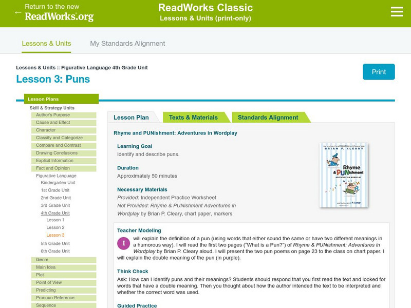 [Free Registration/Login Required] A activity in which young scholars use the book Rhyme & PUNishment Adventures in Wordplay by Brian P. Cleary to learn to identify and understand the use of puns. Lesson includes direct teaching,...