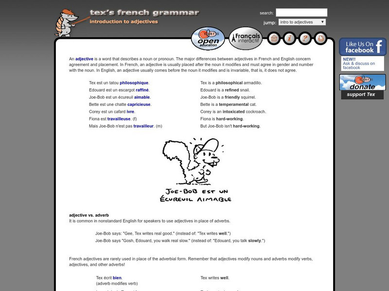 Concise introduction to French Adjectives. Defines adjectives in general and describes agreement and placement of adjectives in French. Has good examples, and contrasts with adverbs.