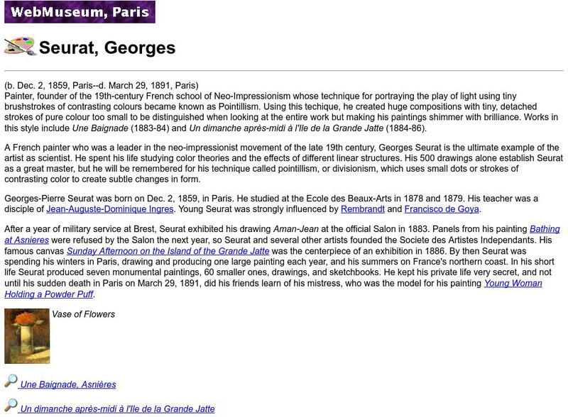 The WebMuseum offers a biography of Georges Seurat (1859-1891 CE), known for his creation of the Pointillism technique of 19th century neo-impressionist painting. Content includes numerous samples of his work, as well as full...