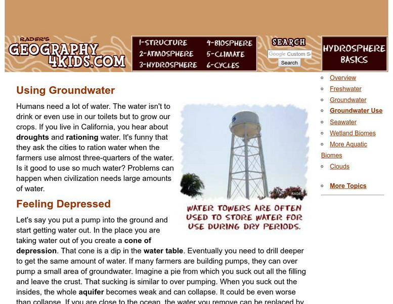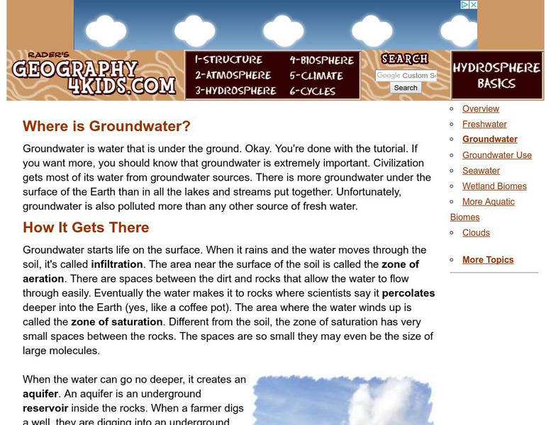 A massive amount of information about groundwater. Topics covered include groundwater basics, humans and groundwater, groundwater quality, and its place in the water cycle. Includes true-and-false quiz and a Q&A section, as well as a...