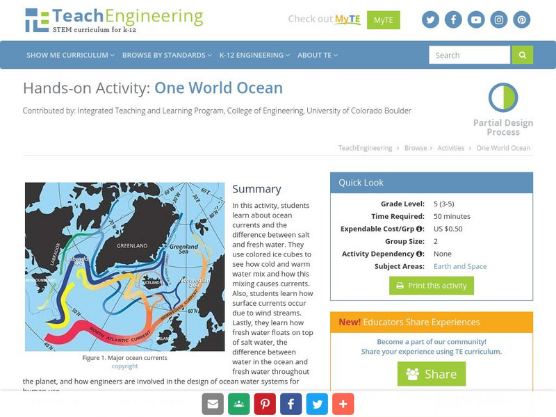 In this activity, students learn about ocean currents and the difference between salt and fresh water. They use colored ice cubes to see how cold and warm water mix and how this mixing causes currents. Also, students learn how surface...