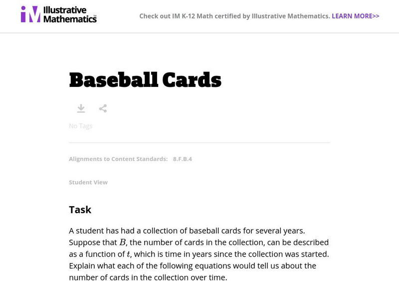 This task has the context of a baseball card collection. Students are shown four equations that might represent the number of cards in the collection where the total is a function of time. They are asked to explain what we can learn...