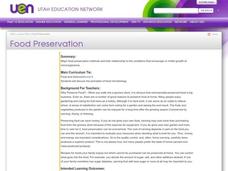 Learners examine the variety of food preservation methods available today. In groups, they participate in an experiment to determine the conditions that encourage or stop the growth of bacteria. To end the lessons, they discuss the...