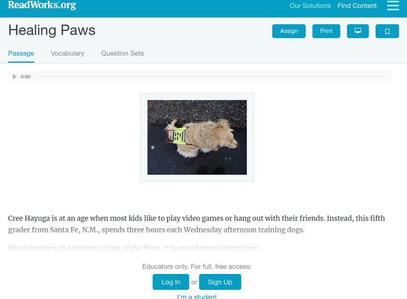 [Free Registration/Login Required] An informational text about a girl who volunteers to train dogs to help people with disabilities. A question sheet is available to help students build skills in reading comprehension.