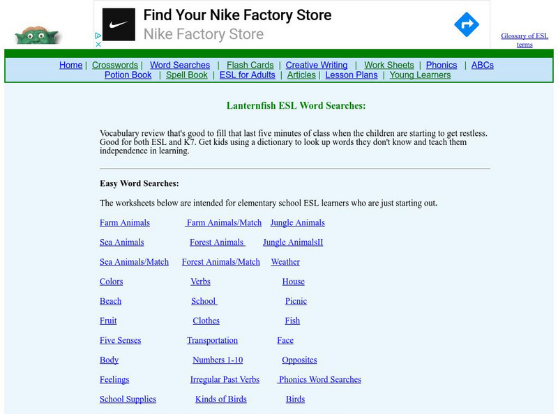 A collection of more than 40 printable word search activities designed for ESL students. Searches are organized by level of difficulty (easy, intermediate to difficult) and cover a wide variety of themes, e.g., colors, verbs, the five...