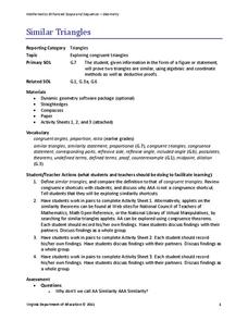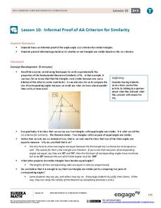 What does it take to show two triangles are similar? The 11th segment in a series of 16 introduces the AA Criterion for Similarity. A discussion provides an informal proof of the theorem. Exercises and problems require scholars to apply...