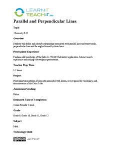 Tenth graders explore parallel and perpendicular lines. In this geometry lesson, 10th graders investigate the relationships associated with parallel lines and transversals, perpendicular lines, and the angles formed by these...