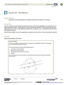 Young scholars explore the concept of translations. In this translations activity, students discuss similarities and differences between images and pre-images. Young scholars apply translations to coordinates of figures. Students use...