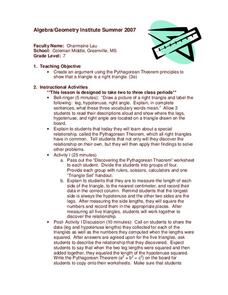 Students discover the Pythagorean Theorem. For this discovering the Pythagorean Theorem lesson, students measure the lengths of various triangles to the nearest centimeter. Students record their measurements in a table. ...