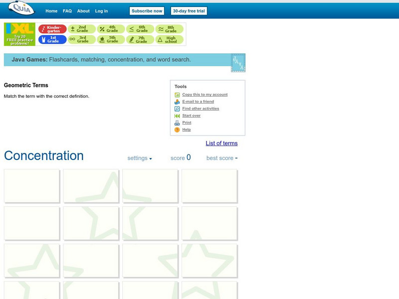 Do you need practice remembering or learning different geometry vocabulary words and definitions? This concentration game is the web site for you! There is a link to a list of terms with definitions you can click if you want to see if...
