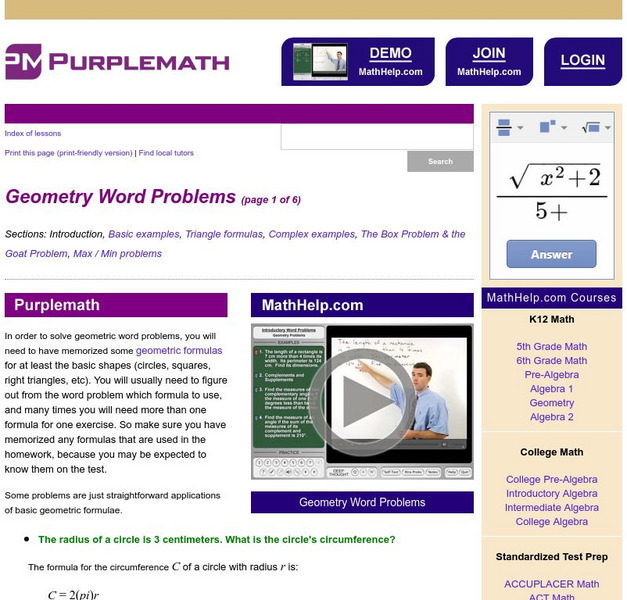 Introduces how to set up and solve simple geometric-figure word problems. Includes advice regarding formulas to memorize.
