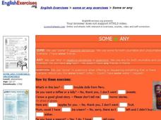 In this interactive grammar worksheet, students complete 25 sentences by typing in the word "any" or "some" to appropriately complete each sentence.