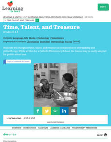 Students look at how time, talent, and treasure are parts of stewardship and philanthropy. In this stewardship and philanthropy lesson, students complete a Time/Talent/Treasure Survey before discussing the answers in a whole group...