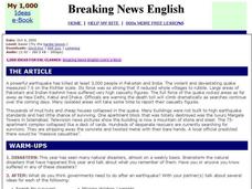 In this earthquake in Pakistan worksheet, students read the article, answer true and false questions, complete synonym matching, complete phrase matching, complete a gap fill, answer short answer questions, answer discussion questions,...