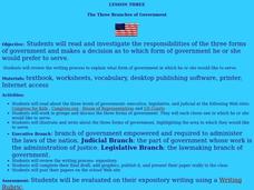 Students write about working in one branch of government. In this branches of government lesson, students read about the three levels of government using various websites and then work in groups to discuss, illustrate and write...