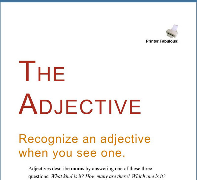 Good information about recognizing adjectives and understanding what they do. Intensive look into adjectives, including phrases that act as adjectives.