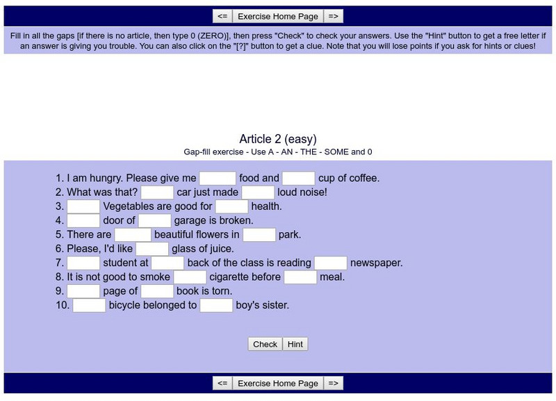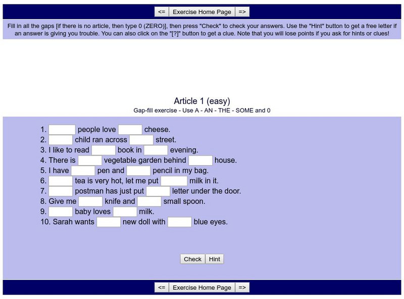 Complete these ten sentences by filling the blanks in with the correct article. Each sentence contains two blanks, and a reminder of possible articles is provided. Hints are available if needed, and answers can be checked when finished.