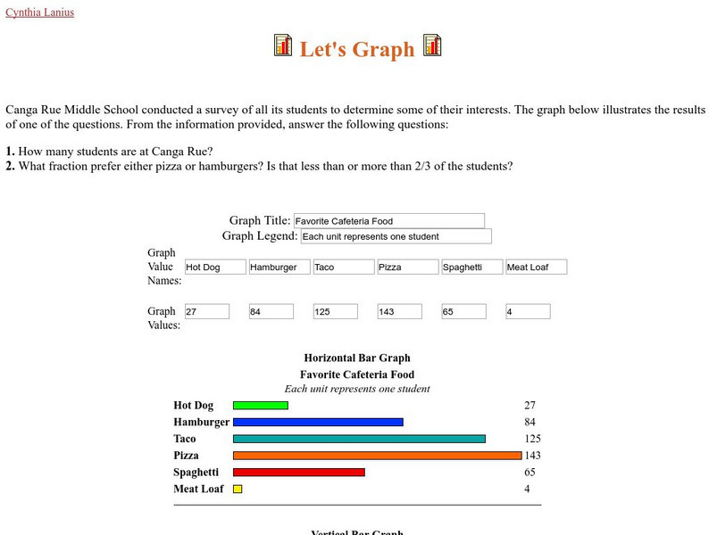 An introduction to bar graphs, both vertical and horizontal in nature. The interactive aspect of this site allows students to change the values of the data - their favorite cafeteria foods - and then see how the graph is changed.