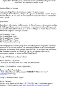 Students examine the time period of the Great Depression. In groups, they discover how the Works Progress Administration helped many workers during this time. Using the internet, they research how the government focused on the arts and...