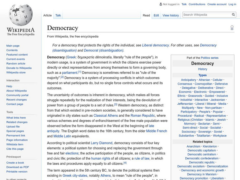 A detailed Wikipedia resource on democracy that explains what it is, what the types of democracy are, and gives examples.