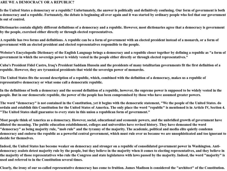 An essay on the present political state in America contending the country is leaning further towards a republican form of government instead of a democracy. Defines and explains the major differences between democracy and republicanism...