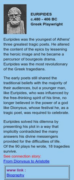 Brief description of how societal traditions developed into theater in Ancient Greece. Includes well-known playwrights and plays as well as links to comprehensive information within and outside of the site.