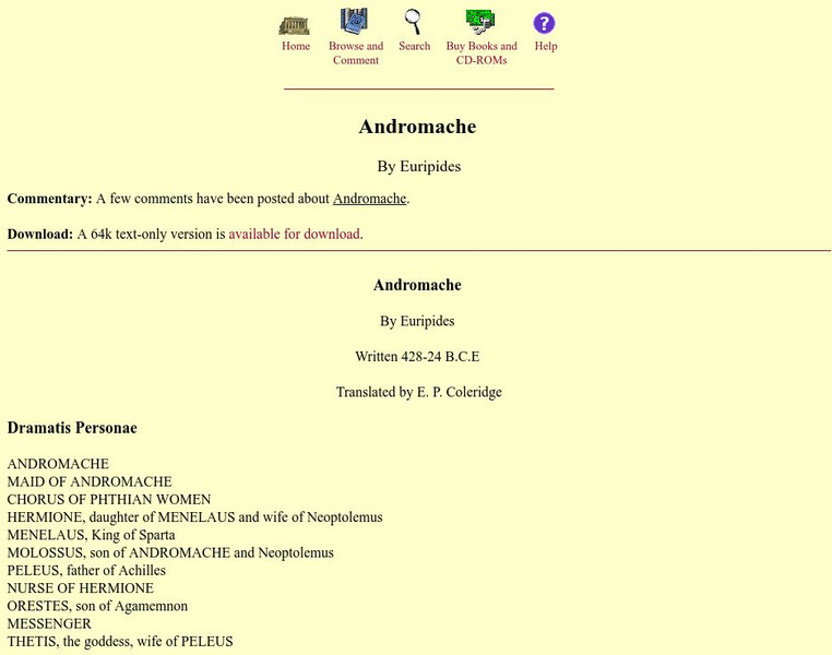 This full text of Euripedes tragedy translated by E. P. Coleridge with readers comments.