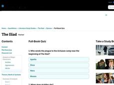 For this online interactive reading comprehension worksheet, learners respond to 25 multiple choice questions about Homer's The Illiad. Students may submit their answers to be scored.