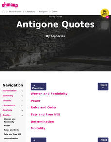 In this online interactive reading comprehension worksheet, students respond to 5 multiple choice questions based on quotations from Antigone. Students may submit their answers to be scored on this timed quiz.