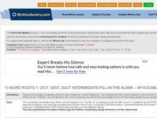 Learners fill in the blanks for 12 sentences with words derived from the Latin roots dict, vent, and duct in an interactive online quiz. A word bank provides choices from the beginning level at MyVocabulary.com. Alert quiz takers that...
