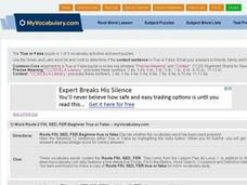 Help your class make sense of vocabulary with this online interactive resource. Using a word bank and information on word roots, pupils determine if each statement is correct, marking true or false. Since this is an online activity, they...