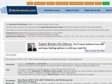 Get your class to puzzle through antonyms, synonyms, and word roots with this online resource! Using a word bank, learners fill in an antonym and a synonym for six words. You could use this as a pre-assessment to see what your pupils...