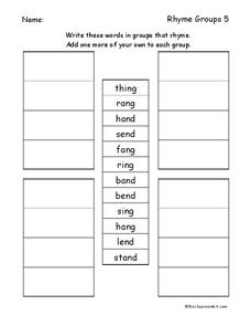 In this rhyming words worksheet, students use a word bank to categorize the list of words into four groups of rhyming words, adding one additional word of their own to each group. Students group sixteen rhyming words.