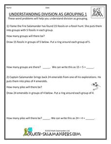 In this understanding of division as a grouping activity, students read two-word problems, then draw the groups to show the answer to the division problem.