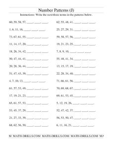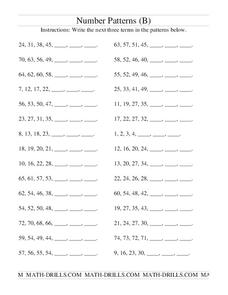 In this number patterns worksheet, students write the next three terms in a set of sequential patterns. A website reference for additional resources and answer key are provided.