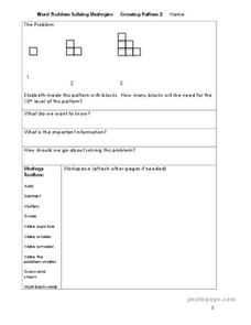 In this word problem strategy learning exercise, students solve and complete 11 different problems and questions related to growing patterns. First, they identify what they know and what information is important. Then, students solve the...