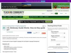 Fourth graders, after brainstorming what the word "guide" means, examine how to use guide words in a dictionary to locate words. They define "guide," identify guide words in a variety of dictionaries and locate words using guide words....