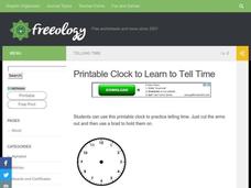 In this telling time worksheet, students practice telling time by cutting out the hands and fix them to the center of the clock with a brad.