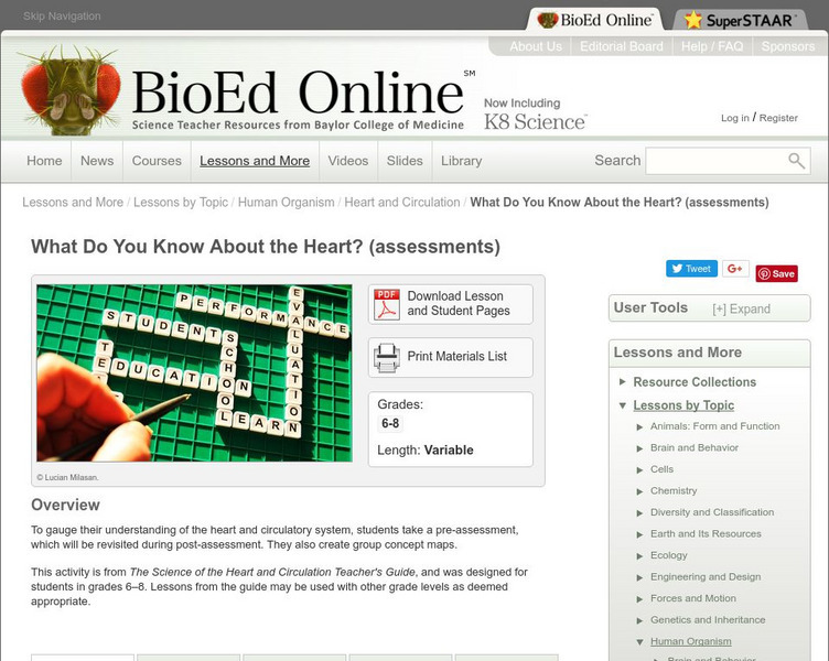 In this unit teachers will evaluate student's current understanding of the heart and circulatory system through a pre-assessment. They will develop group concept maps and then repeat the assessment. Teachers can compare their prior...