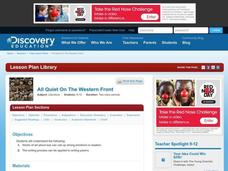 Young scholars create a poem on the subject of war. In this All Quiet on the Western Front lesson plan, students create poetry using phrases or lines that they brainstorm during a pre-writing session. Young scholars enhance their...