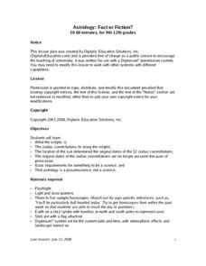 Students investigate the concept of astrology and how it evolved from history. They use the Zodiac in order to find the location of constellations in the night sky. The differences between astrology and astronomy are compared and any...