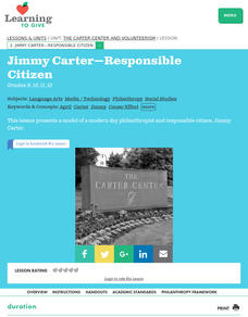 Build on high schoolers' awareness of what's wrong with society. Here they examine Jimmy Carter's extensive involvement in volunteer action in the local, national, and global arenas. Define and explore concepts -- philanthropy, citizen,...