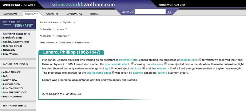This site from ScienceWorld mostly describes Lenard's most notable scientific discoveries and contributions. Includes minimal biographical information and links to additional information on related subjects.