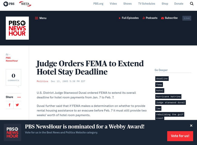 News Hour: Judge Orders Fema to Extend Hotel Stay