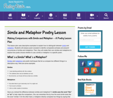 Similes and metaphors are the focus of a poetry lesson complete with two exercises. Scholars read poetry excerpts, underline comparative phrases, then identify whether it contains a simile or metaphor. They then write five...