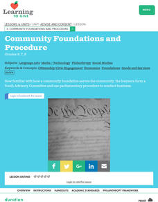 Students research a foundation in their community and how it helps its citizens. They form a youth advisory committee and make recommendations to the mock boards of directors. They practice using parliamentary procedure to complete their...
