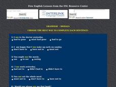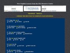 In this ESL modals learning exercise, students complete 10 multiple choice questions, choosing the phrase that best completes a sentence. A website reference for additional resources is given.