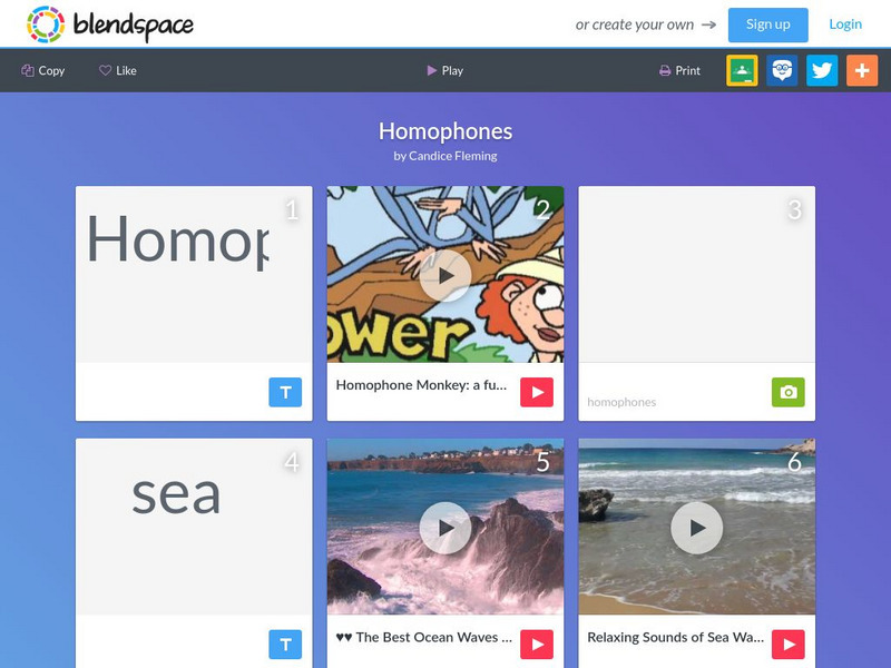 A learning module with 127 links to images, videos, and text to help students learn common homophones including sea/see, hare/hair, pear/pair, ate/eight, flour/flower, son/sun, one/won, and bear/bare.