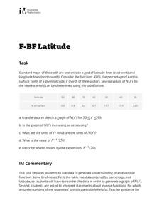 Your young geologists generate a graph given a table of values from the context of latitude and percent of the earth's surface north of that latitude. The questions in the activity then focus the learners to a deeper understanding of the...