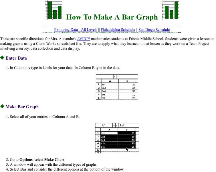 Site contains specific directions for making bar graphs using a Claris Works spreadsheet file.